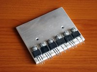 Az áramkörben az összes melegedő teljesítmény-félvezető alkatrész a nyák a műszerdoboz hátulja felé eső oldalán, egymás mellett sorakozik azért, hogy mind egy közös hűtőbordára legyen felszerelhető. A gyakorlatban úgy terveztem és építettem meg az áramkört (bár ehhez nem kötelező ragaszkodni) hogy az összes TO-220-as alkatrész egy kb fél centi vastag alumínium lapra van felcsavarozva, és a hátlapra szerelt hűtőbordára ez a közbelső alumínium idom fekszik fel. Ez számos előnnyel jár. Egyrészt egyben tartja az összes teljesítmény-alkatrészt így könnyebben kezelhető mert egyszerre lehet cserélni az egészet. Másrészt ami nagyon fontos hogy a tesztek idejére amíg még nincs rajta a végleges nagy borda addig is némileg képes hűteni. Ez azért nagyon jó mert néhány másodpercig le tudja hűteni a tranzisztorokat önmagában is és teszteléskor ez pont elegendő. Harmadrészt sokkal könnyebb ha csak 2db csavart kell a hűtőborda lamellái közt becsavarni mint ha mindegyik alkatrészhez egyet-egyet. Ráadásul így a hűtőbordára szerelendő alkatrészek távolságát nem kell hozzáigazítani a hűtőborda lamelláihoz.