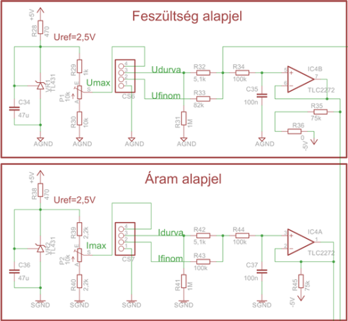 A feszültség és áram alapjelek két szinte teljesen azonos áramköri rész segítségével vannak előállítva. A legfontosabb különbség azonban, hogy a két alapjel-előállító áramkör nem ugyan arra a potenciálra dolgozik rá. Látható a kapcsolási rajzon, hogy a feszültség-alapjel az AGND-hez, az áram-alapjel viszont az SGND-hez viszonyítva képest értendő. Ugyanis a feszültség-szabályozásnak a készülék kimeneti pontjait kell figyelnie, az áram-szabályozásnak ellenben közvetlen az árammérő söntöt. A kettő közt csupán pár centi vezetősáv van a nyáklapon majd a sorkapocs után még néhány centiméternyi vezeték. Ezeknek az ellenállása ugyan rendkívül kicsi, de a sönt értékéhez sajnos hozzámérhető. Ráadásul ezeknek is van hőfokfüggésük de ami még fontosabb hogy hosszuk miatt nem kevés parazita induktivitást képviselnek ami az áramszabályozásnak nem tenne jót (gerjedékenység). A sönt után lévő vezetékszakaszok káros mellékhatásainak kiejtése megoldható lett volna egy kivonó kapcsolásban működő műveleti erősítővel is, de azzal még több félvezető lenne a szabályozókörben. A labortáp-tervezési és építési tapasztalataim szerint minél több félvezető (mondjuk OPA) van a szabályozásban, annál nagyobb az esélye a gerjedésnek. Ezért oldottam meg inkább így, hogy az áram-alapjel a söntre dolgozik rá.