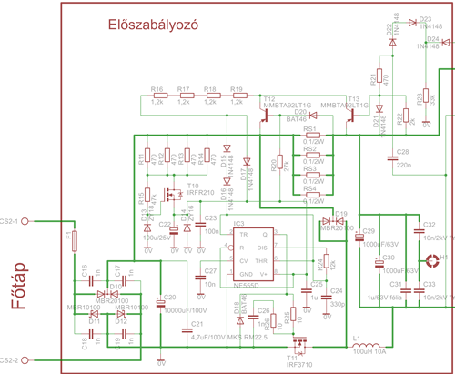 Nagyobb értékű kimenő áram esetén RS1, RS2, RS3, RS4 sönt ellenállásokon jelentős teljesítmény disszipálódna. Ennek a teljesítménynek a csökkentése céljából R20 segítségével előfeszítjük D20 diódát és így annak nyitófeszültsége hozzáadódik a söntön eső feszültséghez, ezért T12 nyitásához már kisebb feszültségnek kell esnie a sönt ellenállásokon. R16, R17, R18 és R19 ellenállások a T12 és T13 tranzisztorok kollektoráramát korlátozzák. A disszipáció miatt állnak négy darabból. D15, D16, D17 diódák megakadályozzák, hogy C24 az NE555 (IC3) tápfeszültsége fölé töltődjön és károsítsa az IC-t.