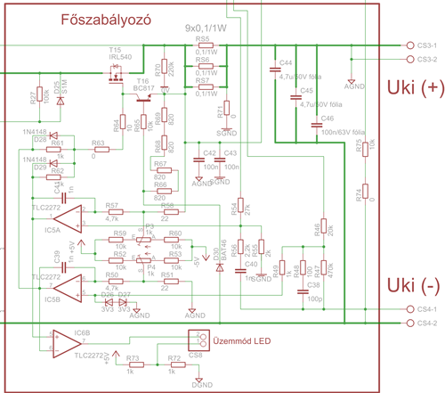 A szabályozást T15 végzi. Disszipatív tápegységeknél itt több párhuzamosan kötött tranzisztor szokott lenni az áram elosztása végett, hogy kisebb teljesítmény essen a tranzisztorokon. Ebben a labortápegységben viszont az előszabályozás miatt elegendő egyetlen tranzisztor is mert a legrosszabb esetben (10A kimenő áramnál) is csupán kb 10W-ot kell neki eldisszipálnia. Előszabályozás nélkül ez akár kb 550W is lehetne! Tranziens-jelleggel, például a terhelés rákapcsolásának pillanatában azonban könnyen előfordulhat hogy rövid ideig jóval nagyobb terhelés éri a tranzisztort. A labortápegység úgy lett méretezve hogy bármi történjen is, a T15 pozícióban lévő IRL540 mindig a „maximum safe operating area” nevezetű görbéjén belül maradjon. A térvezérlésű tranzisztorok (FET-ek) maradékfeszültsége kisebb mint a bipolárisaké, ezért lett T15 fet. R70 a T15 szivárgó áramát nyeli el. R27 is közvetve a szivárgóáramot csökkenti, ha ugyanis a kimeneti feszültség mondjuk 50V, majd lejjebb tekerjük vagy lekapcsoljuk miközben a kimeneten nincs terhelés, akkor C29-C30 elkókon megmaradna az előzőleg beállított magasabb feszültség és csupán az elkók saját szivárgóárama sütné őket ki nagyon lassan. A főszabályozó viszont leszabályoz amennyire szeretnénk, a feszültség-különbség pedig megmaradna az áteresztő-feten. A nagyobb maradékfeszültség pedig nagyobb szivárgóáramot jelentene, melynek végeredménye az lenne hogy nem lehetne a kimeneti feszültséget terhelés nélkül teljesen 0V-ra levinni. Az IC5A végzi az áram-szabályozást, IC5B pedig a feszültség-szabályozást. R54-R55 az áram-alapjelet osztják le hogy a söntön megjelenő feszültséggel azonos tartományú legyen. E leosztás korábban, az IC4A bemenetén vagy az áram-állító potméterek előtt is történhetne, de így hogy a lehető legvégső pontban történik a leosztás, javul a jel/zaj viszony és az IC4A offszete kevésbé jelent problémát. Az áteresztő fetet (T15) az OPA-k D28-R61 és D29-R62 alkotta analóg VAGY kapcsolattal tudják vezérelni. A korábban említett fordított polaritás-védelmet T16 valósítja meg. Üzemszerű állapotban T16 le van zárva mert D30 záróirányba van előfeszítve és R66-R67-R68-R69 lehúzzák T16 bázisát. Ha azonban a labortápegység kimenetére fordított polaritással kapcsolunk külső feszültséget (kondenzátor, akkumulátor, másik tápegység stb…) akkor D30 alacsony nyitófeszültségű schottky dióda kinyit és áramot folyat R65-ön keresztül T16 bázisába aminek hatására kinyit, az áteresztő FET gate-jét lesöntöli és ezzel lezárja. A feszültség-szabályozás ettől függetlenül még működne és igyekezne fenntartani a kimeneti feszültséget amit beállítottunk, de T16 által képviselt védelem ezt felülírja. D25 nagy áramú dióda a C29-C30 elkókat védi a fordított polaritás ellen, hogy ha esetleg tranziens jelleggel mégis elmennének kicsit negatívba. Hiszen idő kell míg D30 és T16 kinyit, majd T15 gate-kapacitása kisül. Az üzemszerű állapot visszatérésekor (a fordított polaritású külső feszültség elvételekor) T16 ismét lezár és a szabályozás tovább működik. Így sem a labortápegység, sem pedig a külsőleg csatlakoztatott feszültségforrás nem megy tönkre. Az üzemmód-jelző LED-ek CS8 csatlakozóra kapcsolódnak, ellenpárhuzamosan bekötve. Az üzemmód-figyelést IC6B végzi, kimenetén feszültség-generátoros módban +5V, áramgenerátorosban pedig -5V van. Ha az SMD jumpert úgy állítottuk be hogy az OPA-k egytápfeszről működjenek, akkor áramgenerátoros módban -5V helyett 0V lesz az IC6B kimenetén. Ez jön a LED-ek egyik lábára, a másikra pedig az R73-R72 közös pontja. Ha +5V-ra van állítva az SMD jumper akkor e két ellenállás féltápfeszültséget hoz létre és így működhet a két ellenpárhuzamosan kapcsolt üzemmód-jelző LED. Ha viszont +-5V-ra van állítva a jumper és erről működnek az OPA-k akkor R73-at nem kell beforrasztani! Ez esetben ugyanis nincs szükség a féltápfeszre, ilyenkor R72 egymagában csupán a LED-ek áramát korlátozza. Így használhatunk külön egy LED-et az áramgenerátoros üzem és egyet a feszgenerátoros üzem kijelzésére is. IC6A feladata kettős. Legfontosabb hogy kivonó kapcsolásban működik, ugyanis a sönt (RS5-RS6-RS7) feszültségéből levonja a sönt után lévő vezetékszakaszokon mérhető parazita jelet. Korábban, az áram-alapjel előállításánál írtam hogy erre miért van szükség. Akkor az ok a szabályozás esetén való kiejtés volt, IC6A viszont a panelmérő számára vonja ki a vezetékszakaszokon eső feszültséget hogy e parazita elemek ne csak a szabályozásba hanem a mérésbe se szólhassanak bele. Mellesleg ha már ott van IC6A akkor beállítottam neki 9-szeres erősítést is (1+R78/R79) mert a PIC-es panelmérőimet mindig 0,1Ω-os sönthöz építem meg. RS5-RS6-RS7 pedig a kapcsolási rajzon 3db, de a valóságban 3*3db 0,1Ω-os teljesítmény-ellenállásból épül fel. Így az egyébként nagy (összesen 9W-os) ellenállástesten kisebb feszültség esik, így kisebb rajta a disszipáció, nem melegszik annyira és ezért nem mászik el. IC6A csak azért erősít hogy a panelmérőimet ne kelljen átméreteznem ehhez a sönthöz. Nagyon fontos az IC6A-nál hogy az azonos értékű ellenállások, azaz az R76-R79 és az R77-R78 párosok azonos értékűek legyenek! Nem baj ha nem pont 15k-sok a 15k-sok és nem pont 120k-sok a 120k-sok, de egymáshoz a két 15k-s és a két 120k-s minél közelebb kell hogy legyen, különben súlyozott kivonó áramkör lesz belőlük.