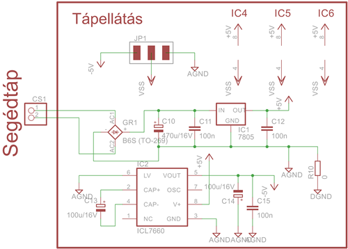 A labortápegység működtetéséhez szükség van egy segédtáp-feszültségre, melyet a CS1-es csatlakozón juttatunk a panelra. Ez lehet AC és DC feszültség is. GR1 egyenirányít, C10 ezt pufferolja, C11 szűri. IC1 (7805) stabil 5V-ot állít elő amit C12 megint szűr. Erről az 5V-os tápfeszültségről működnek a műveleti erősítők, a referenciaforrások, LED-ek és a panelmérő is. A panelmérőnek és pár apróbb dolognak szüksége van -5V-ra is, ezt IC2 állítja számukra elő a pozitív 5V-ból. Az ICL7660 (IC2) kimondottan erre a célra van kitalálva. Egy rém egyszerű áramkör, C13 elkót feltölti 5V-ra majd leválasztja onnan és rákapcsolja a kimenetére fordítva. Ezt csinálja folyamatosan. Ennek egy hátránya van, hogy ez a -5V nem nagyon terhelhető, de a labortápnak és a panelmérőnek nincsenek is ilyen igényei. Az előállított tápfeszültségeket a panelmérő a CS9-es csatlakozón kaphatja meg. Ennek lábkiosztása megegyezik a PIC-es panelmérőimben használt tápcsatlakozóéval. A labortápegységben három különböző földpotenciál van. Ezek: AGND, DGND és SGND. Az AGND az analóg föld, ez teríti be a nyák felső oldalát teliföldként is. Egyébként ennek a huzalozás megkönnyítése mellett árnyékoló, zavarszűrő funkciója is van. A DGND-re (digitális föld) a labortápegységnek csupán az üzemmód-jelző LED-eknél van szüksége, viszont a panelmérőnek annál inkább. Az SGND a főszabályozó áramfigyelő söntjének (RS5-RS6-RS7) kimenet felé eső pontja. Erre azért van szükség hogy a sönt után lévő vezetékszakaszok parazita jellemzői (ellenállás, induktivitás, hőfokfüggés) az áramszabályozásba és árammérésbe ne szóljanak bele. Az áramkörben van egy SMD jumper, mely gyakorlatilag három kis rézfelület a nyákon egymás mellett. A középsőt az egyik vagy a másik szélsővel, egy ónpacni által összefolyatva kiválaszthatjuk hogy a műveleti erősítők negatív táplába AGND-t vagy -5V-ot kapjon-e. Így tehát a műveleti erősítők működhetnek +-5V-ról és szimpla +5V-al is. Ezt azért oldottam meg így mert mint korábban említettem a labortápegységnek a fejlesztés folyamán volt egy olyan állapota ahol speciális ultra alacsony offszetű műveleti erősítők (AD8572) dolgoztak benne, ezek azonban egy tápfeszről jártak. Végül sikerült megválni tőlük és kiváltani őket egy sokkal kommerszebb típusra (TLC2272), de úgy döntöttem hogy a végleges nyákterven meghagyom a lehetőségét annak hogy ezt az OPA-t is használni lehessen.