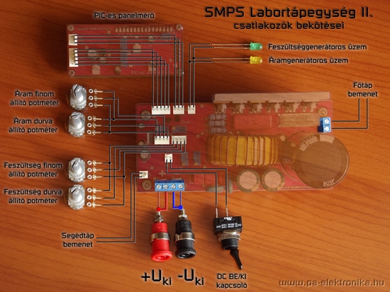 Ha az áramkör elkészült, akkor jöhet a többi dobozolással kapcsolatos művelet. Kössük be az állító potenciométereket, a LED-eket, a hálózati és a DC BE/KI kapcsolót illetve ha szeretnénk akkor az igényeinknek megfelelő panelmérőt. Ha a PIC-es panelmérőim egyikét választjuk, akkor azoknak 400V-os és 40A-os méréshatárúaknak kell lennie és 0,1Ohm-os sönthöz kell megépítve lennie. Ha 40V-nál kisebb maximális feszültségen és/vagy 4A-nál kisebb maximális kimenő áramon használjuk az SMPS Labortápegység II-t akkor kisebb méréshatárok is megfelelnek természetesen. A PIC-es panelmérőt egyszerűen csak a labortápegység nyákján található 5 és 3 pólusú csatlakozókhoz (CS9, CS10) kapcsoljuk, ezen csatlakozók lábkiosztása pontosan ugyan az mint a panelmérőimen lévő párjuké.