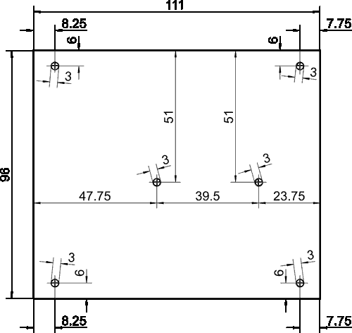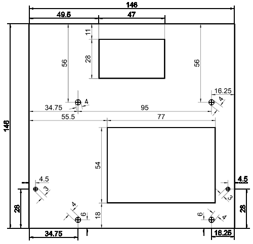A tápegység előlapját úgy készítettem, hogy A4-es matricára kinyomtattam az előlap feliratait, majd erre úgynevezett üvegfóliát ragasztottam (mindkettő beszerezhető bármelyik írószerboltban). Utóbbira azért van szükség, hogy a tapicskolástól ne zsírosodjon és ne ázzon el az előlap. Miután az üvegfólia rákerült a matricára, lehúztam a matrica hátulját és szépen ráragasztottam az előlapra. Érdemes a matricát nagyobbra hagyni minden oldalán 1-2 centivel, majd a felragasztás után a túllógó részeket az előlap hátoldalán visszahajtani és hogy biztos ne engedjen el; pillanatragasztóval az előlaphoz ragasztani. A panelmérő előlaphoz rögzítését úgy oldottam meg hogy két előlapja van a tápegységnek melyek össze vannak fogva. A hátulsó 2mm, az elülső pedig 1mm vastag lemez. A két előlap kivágásai teljesen megegyeznek annyi különbséggel, hogy a hátulsó lemezen van a kijelző körül 4db 3mm-es furat amik sülyesztettek. A panelmérőt az előlaphoz ezen négy furatba helyezett süllyesztett csavarok rögzítik. Azonban hogy ez a négy csavar ne látszódjon kívülről, van még a külső előlap mely eltakarja a csavarokat. Lehetett volna azt is hogy egyszerűen a vastagabbik előlapra ragasztom rá az előlapi matricát, de akkor ha a panelmérőhöz esetleg később hozzá szeretnék férni akkor az az előlap tönkretételével (a matrica lehúzásával) járna. Az előlapot természetesen másmilyen elrendezéssel is elkészíthetjük mint amilyennel én tettem, ha viszont megfelel az amit én használtam akkor ahhoz itt van alább pár rajz segítségképp. A rajzokra nincsenek méretek írva, egyszerűen csak nyomtassuk ki őket, tegyük rá az előlapra és pontozóval jelöljük meg a furatok közepeit: