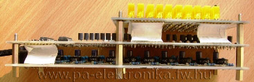 A sávszűrő panelról 10db vezetékkel a jel és 2db vezetéken pedig az 5V-os tápfeszültség jut át a középső panelra. Az LM3915 (vagy LM3916) bemenetére a CD4066 analóg kapcsolóival történik az oszlopok egymás utáni jeleinek kapcsolása. A CD4017 lépteti az egyes oszlopokhoz tartozó jelet az LM3915 bemenetére, illetve a kimenetére a megfelelő LED-oszlopot. A vezérlő áramkörben a 4066 analóg kapcsolóinak KI és BE- menetei, illetve azok sorrendje felcserélhető, és az oszlopok bekapcsolásának sorrendje is, mivel ez úgysem látszik a magas kapcsoló frekvencia miatt. Ezért a nyáktervezés megkönnyítése és az átkötések minimalizálása miatt éltem ezekkel a felcserélhetőségi lehetőségekkel. Emiatt néz ki a valós kapcsolási rajz -az elvi rajztól eltérően- úgy ahogy. Az 555 (IC5) az órajelet adja a 4017-nek. A MOD kapcsolóval válthatunk a DOT és BAR kijelzés közt (pont vagy oszlop). Az R3-R12 alkatrészek a LED-ek előtét-ellenállásai. Csökkentve ezeket nagyobb fényerő érhető el.