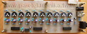 A sávszűrő panelre kapcsoljunk 5V-os tápfeszültséget majd ellenőrizzük, hogy a GND-hez képest az ICL7660 5-ös lábán megvan-e a -5V. Ha csak -3V az sem baj. Ez után a TL074-ek 11-es és 4-es lábaik közt nézzük meg hogy megvan-e a 8-10V-os tápfeszültség. Ha van jelgenerátorunk és oszcilloszkópunk, akkor ellenőrizhetjük egyenként a sávszűrők helyes működését. Ha nincs jelgenerátorunk, akkor használhatjuk EZT az mp3 fáljt is. Ha nincs oszcilloszkópunk, akkor millivoltmérőt is használhatunk. Ha az utóbbiak közül egyik műszer sincs kéznél, akkor a fentebb írt módon illesszük a sávszűrő panelt a másik kettőhöz (átkötő huzalokkal való összeforrasztás). Ne felejtsük el a sávszűrő és a vezérlő panelok közt a 10db jelvezeték mellett a tápfeszültséget is átvezetni!