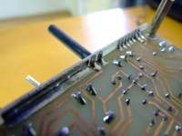 A vízszintes panel egyik sarkánál lévő két vastag vezetősáv végeit a panel szélén egy reszelővel be kell reszelnünk. Ez azért kell, mert ha a két panelt összeszereljük, akkor az áram ’át tudjon bújni’ ezen a résen. A megvastagított vezetősávokat ónnal végig kell folyatni, mert ezeken a fólia-szakaszokon nagyobb áram folyik. Ha nem reszelnénk ki ezt a két kis részt a panel széléből, akkor az egyik panelról a másikra az áram csak a keskeny rézfólián tudna átfolyni, mivel a két panel összeszorul.