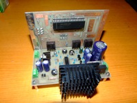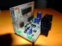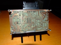 Először a vízszintes panelt ültessük be, kezdve a 3db átkötéssel. Utána méret szerinti sorrendben az ellenállásokat, a kerámia kondenzátorokat, diódákat, majd a trimmereket, sorkapcsokat, elkókat, tranzisztorokat, ic-ket... Végül forrasszuk be a 3db potmétert és ellenőrizzük, hogy (a még nem beültetett) függőleges panelen lévő lyukakon átfér-e a menetes részük és nem feszülnek-e. Végül szereljünk a végtranzisztorokra hűtőbordát és a 7805-re hűtőzászlót. A fényképeken látható hűtőborda kicsi! Ennél jóval nagyobb kell a végtranzisztorokra!